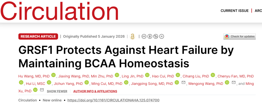 2026年1月5日,北京大学第三医院心血管内科徐明教授团队在心血管领域一流期刊Circulation(《循环》IF:38.6)在线发表了题为“GRSF1 Protects Against Heart Failure by Maintaining BCAA Homeostasis”(GRSF1通过维持心肌BCAA代谢稳态改善心力衰竭)的研究成果。该研究发现RNA结合蛋白GRSF1通过转录后调控机制维持心肌支链氨基酸(BCAA)代谢稳态,从而改善心脏重塑。