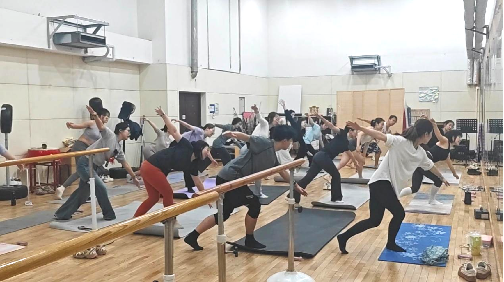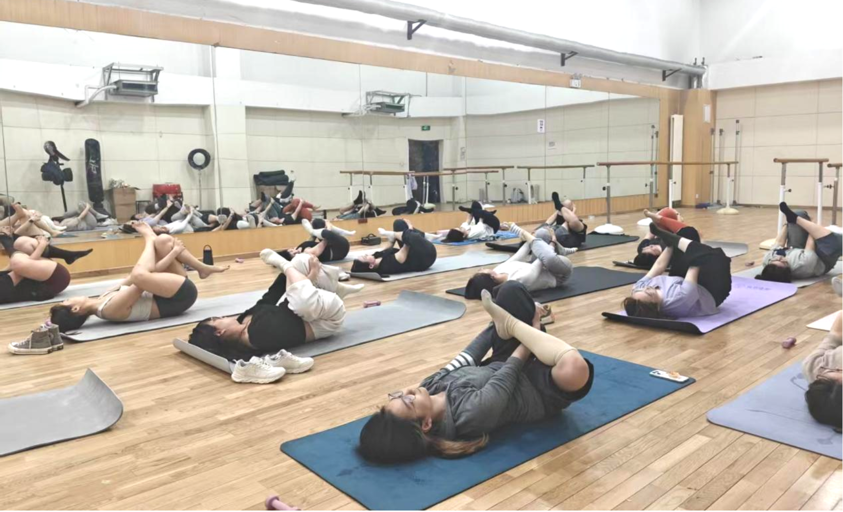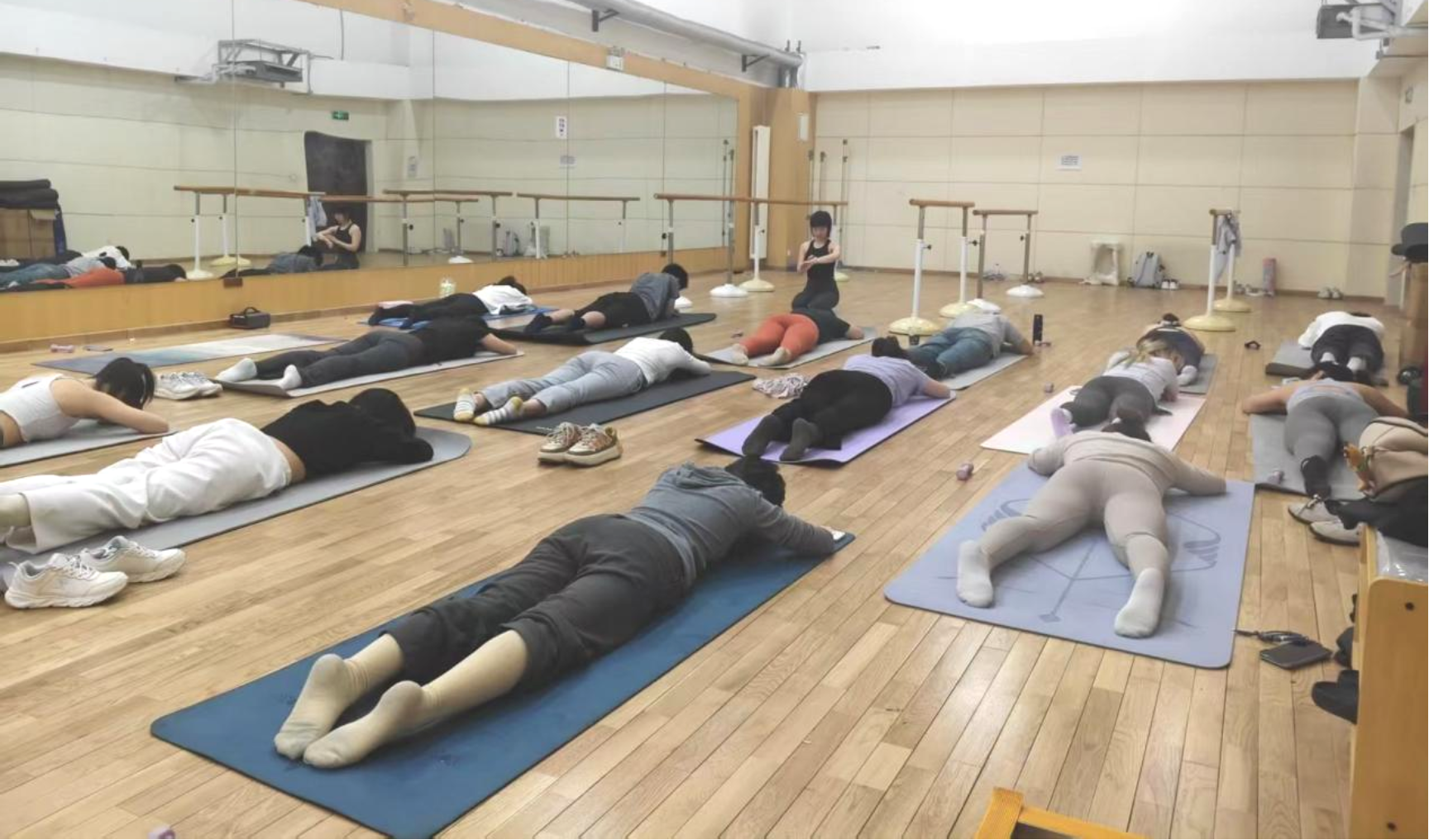之后通过把杆辅助开展下肢训练环节,老师带领同学们进行腿部与臀部的针对性练习,通过控制与重复强化肌肉耐力。这一阶段不仅考验体能,也考验意志力。在持续的练习中,同学们逐渐突破自身的舒适区,感受到身体潜能被激发的过程。与此同时,规律的动作与呼吸也帮助大家维持稳定的心理状态,使“坚持”本身成为一种积极的心理体验。