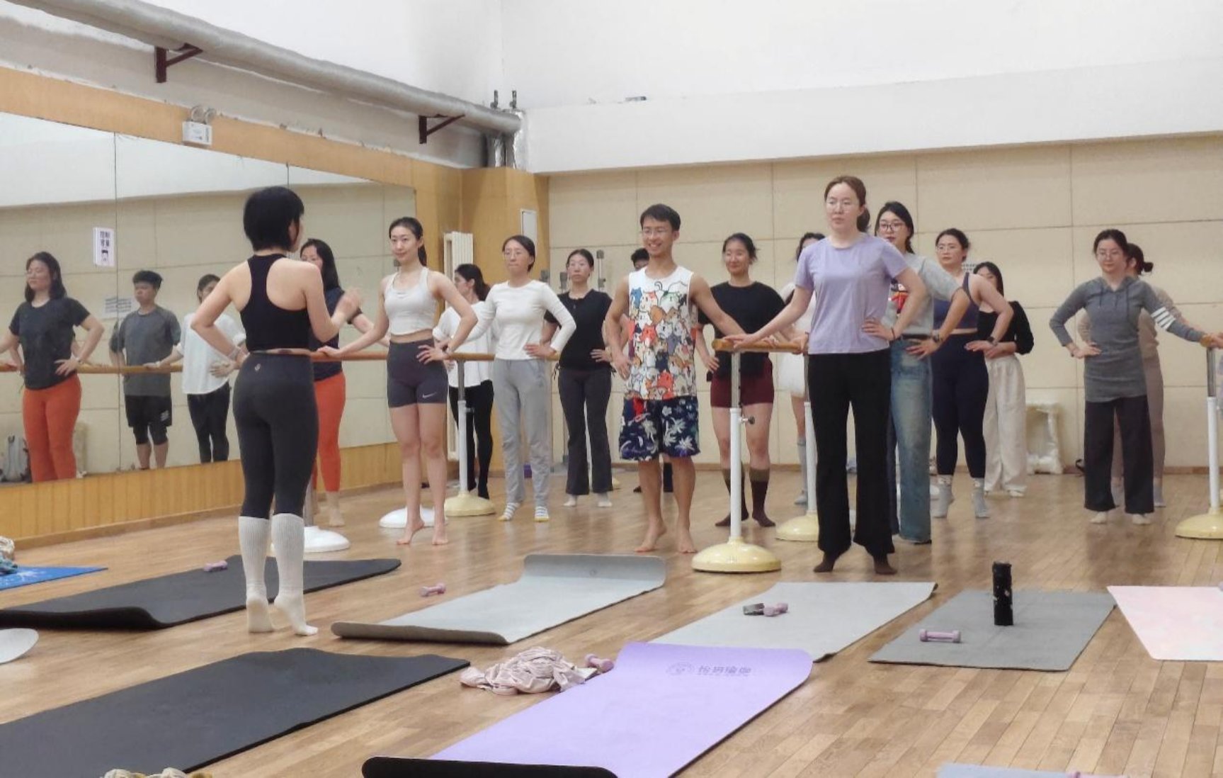 在正式练习前,张珊对Barre的基础动作元素进行了细致讲解与示范,包括站姿调整、核心收紧、手臂与腿部的基本发力方式。她引导同学们关注身体的细微变化,比如肌肉的收缩、关节的稳定以及呼吸的节奏,使每一个动作都成为一次与身体对话的过程。在讲解过程中,老师耐心纠正同学们的动作细节,帮助大家建立正确的发力模式,为后续训练打下良好基础。