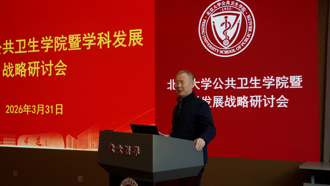 2026 年3 月 31 日,北京大学公共卫生学院隆重举办学院暨学科发展战略研讨会。会议深入贯彻落实党的二十大及历次全会精神、北京大学第十四次党代会精神和医学部最新工作部署,落实北京大学“管理质效年”工作要求,全面复盘学院发展成果,聚焦学科建设关键问题交流研讨,凝聚发展共识,擘画未来蓝图,全力推动学院及公共卫生学科高质量发展。医学部王嘉东副主任,研究生院、学科建设办公室徐明院长、主任,教育处刘虹处长,人事处丁磊处长,国际合作处刘燕处长,设备与实验室管理处沈如群处长,科学研究处邓锐副处长,学科建设办公室曹原副主任等领导应邀出席。学院党政领导班子、党委委员、学术委员会委员、各学科群及系所负责人、各级人才项目入选者、虚体中心及校企联合实验室负责人、教工党支部书记、行政办公室负责人等82人参会,共商学院发展大计。会议由郝元涛书记主持。