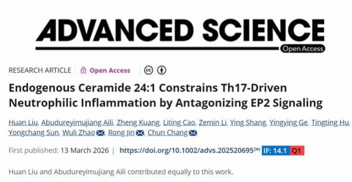 2026年3月13日,北京大学第三医院呼吸与危重症医学科常春教授团队在国际知名期刊Advanced Science(《先进科学》,IF:14.1)上在线发表题为“Endogenous Ceramide 24:1 Constrains Th17-Driven Neutrophilic Inflammation by Antagonizing EP2 Signaling”(内源性神经酰胺Cer24:1通过拮抗EP2信号通路抑制Th17介导的中性粒细胞炎症反应)的研究论文。研究首次揭示了内源性神经酰胺Cer24:1通过拮抗EP2信号通路,抑制Th17介导的中性粒细胞哮喘炎症的作用机制,为激素抵抗性哮喘的干预提供了新的代谢免疫学视角。