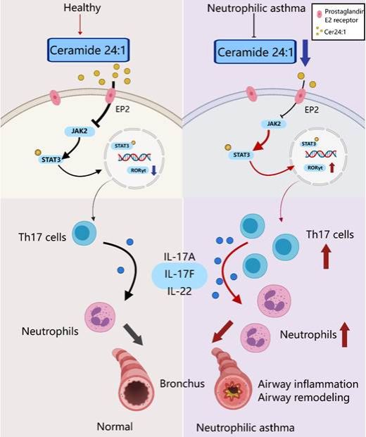 中性粒细胞哮喘是哮喘中治疗难度较大的亚型,患者常对糖皮质激素治疗不敏感,且伴有明显的Th17型炎症反应。本研究通过对临床样本及小鼠模型进行脂质组学分析,发现神经酰胺Cer24:1在中性粒细胞哮喘中表达显著降低,其水平与疾病严重程度及中性粒细胞炎症呈负相关。进一步机制研究表明,补充Cer24:1可显著减轻模型小鼠的中性粒细胞浸润,抑制Th17相关炎症反应。机制上,Cer24:1可直接作用于CD4⁺ T细胞表面的前列腺素E2受体EP2,抑制其信号通路激活进而限制Th17分化,发挥抗炎保护作用。