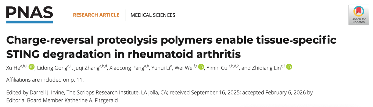 2026年3月12日,我校基础医学院林志强研究员与第一医院崔一民教授团队共同在PNAS杂志发表了题为“Charge-Reversal Proteolysis Polymers Enable Tissue-Specific STING Degradation in Rheumatoid Arthritis”的研究论文。该研究报道了一种“电荷反转蛋白降解靶向嵌合体(CreTACs)”的智能可编程高分子药物,实现了对STING蛋白的组织特异性精准降解,为类风湿关节炎治疗提供了全新策略。