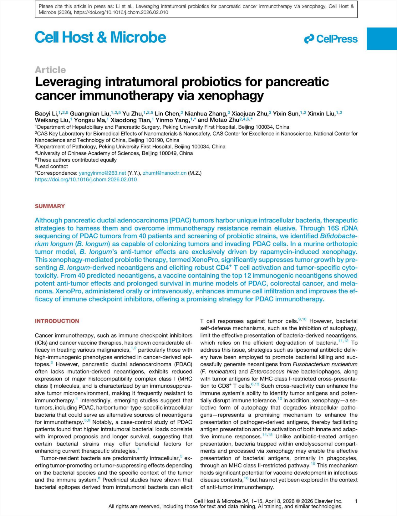 近日,北大医院杨尹默教授团队与国家纳米科学中心朱墨桃教授团队在国际顶尖宿主-微生物互作领域期刊《Cell Host & Microbe》(影响因子18.7)上发表了科研成果,为胰腺癌免疫治疗开辟了全新路径。该研究巧妙地利用药物诱导的“异源自噬”(Xenophagy),迫使肿瘤细胞降解其内部的益生菌,从而释放出大量“菌源”新抗原,成功将“冷”肿瘤转化为“热”肿瘤,并在此基础上开发出了具有广谱抗癌潜力的“菌源”疫苗。