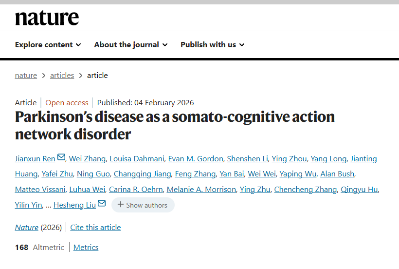 神经内科王朝霞教授团队作为参与团队之一,完成了昌平实验室刘河生教授主导的一项帕金森病重要基础与临床交叉研究,其成果《Parkinson's disease as a somato-cognitive action network disorder》发表于国际顶级学术期刊《Nature》。北大医院神经内科运动障碍专业组为该项研究的临床设计、患者队列构建及结果验证提供了重要支持。王朝霞教授、魏路华副主任医师为合作作者。