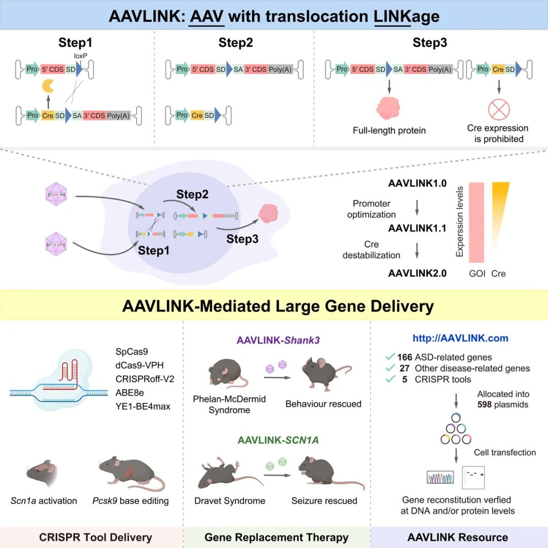 基因治疗作为一种重要的疾病干预策略,其主流递送载体——腺相关病毒(AAV)因包装容量有限(约4.7 kb),难以递送孤独症等多种疾病所需的大基因,而现有递送策略又普遍存在重组效率低、蛋白表达异常等问题,制约了临床转化。为此,研究团队创新开发了AAVLINK技术,该技术基于Cre/lox介导的DNA重组机制,可在体内高效、精准地重构全长基因,并大幅减少异常截断蛋白的产生。动物实验证实,AAVLINK能成功递送并表达孤独症基因Shank3与癫痫基因SCN1A,有效改善相应模型的行为表型;其升级版AAVLINK 2.0通过引入易降解Cre酶,进一步提升了安全性与临床转化潜力。此外,团队还构建了覆盖193个遗传病相关基因及多种基因编辑工具的载体库,推动AAVLINK从单一技术发展为可规模化应用的通用型基因递送平台,为多种遗传病的治疗提供了标准化解决方案。