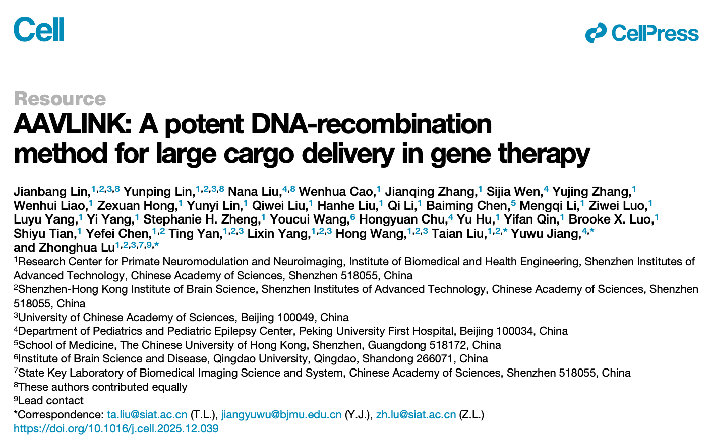 中国科学院深圳先进技术研究院(简称“深圳先进院”)路中华研究员团队联合北大医院儿童医学中心姜玉武教授团队,在国际顶级期刊《Cell》发表题为“AAVLINK: A potent DNA-recombination method for large cargo delivery in gene therapy”的研究论著。该研究提出的创新性AAVLINK技术,成功攻克腺相关病毒大基因载荷递送的核心难题,为孤独症和癫痫等疾病的大片段基因治疗开辟全新范式。