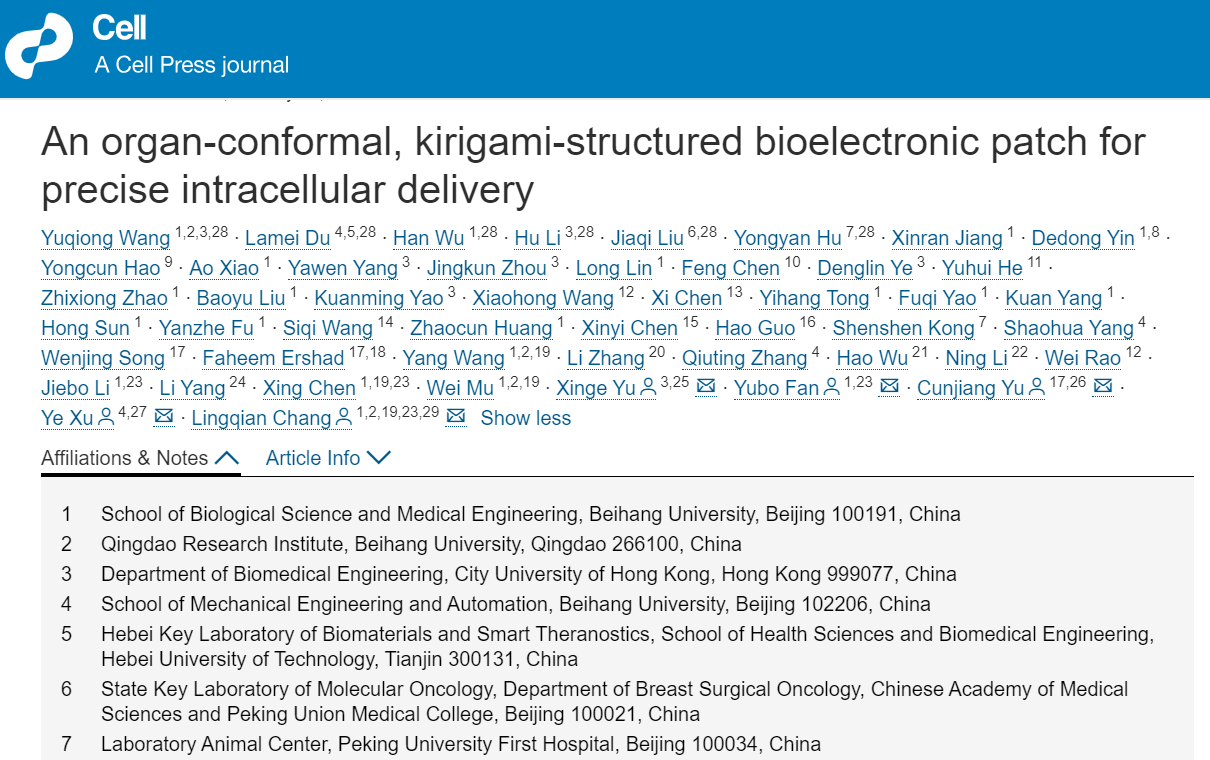 由北京航空航天大学医学科学与工程学院常凌乾教授团队设计主导,北大医院实验动物中心、中国医学科学院肿瘤医院、香港城市大学、美国伊利诺伊大学等不同领域科研人员共同合作,在国际顶级期刊《Cell》发表题为“An organ-conformal, kirigami-structured bioelectronic patch for precise intracellular delivery”的突破性成果,利用柔性电子实现时空精准药物递送。