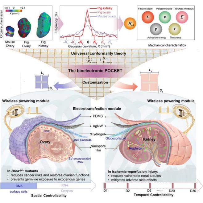 研究团队受传统剪纸智慧启发,研发出一款柔性可植入生物电子器件(POCKET),如同一个智能“口袋”,通过个性化定制,可实现完美贴合于复杂形状的器官表面,并通过“纳米电穿孔效应”,实现安全、高效、精准的全器官药物递送或基因转染。北大医院实验动物中心胡永艳副主任作为共同第一作者对该研究做出重要贡献。