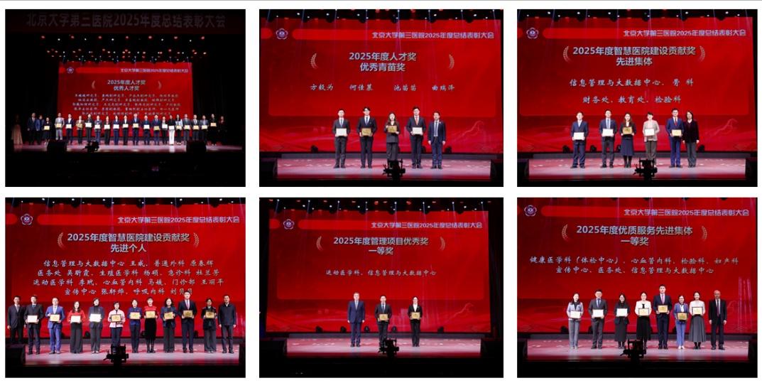 北医三院2025年完成了从核心AI大模型落地,医、药、教、研、服、管全方位AI矩阵应用,实现与医院业务的深度融合。大会颁发2025年度智慧医院建设贡献先进集体及先进个人奖。