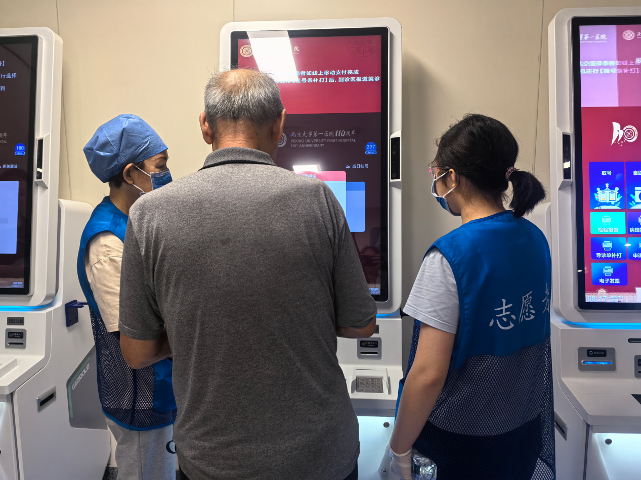 门诊大厅里,自助机志愿者是最忙碌的身影。由我院门诊部组建的北大医院志愿服务队每天有五六十位身穿蓝马甲的志愿者穿梭在自助机、报到机等终端旁,用耐心破解患者“数字鸿沟”。