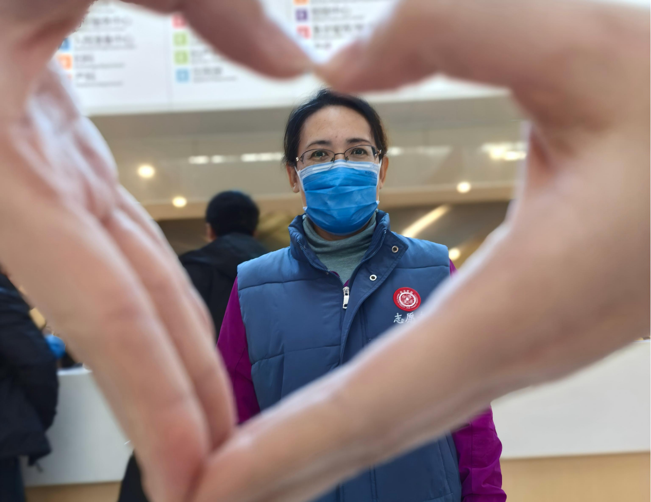 志愿者们身穿蓝马甲在门诊大厅开展志愿服务