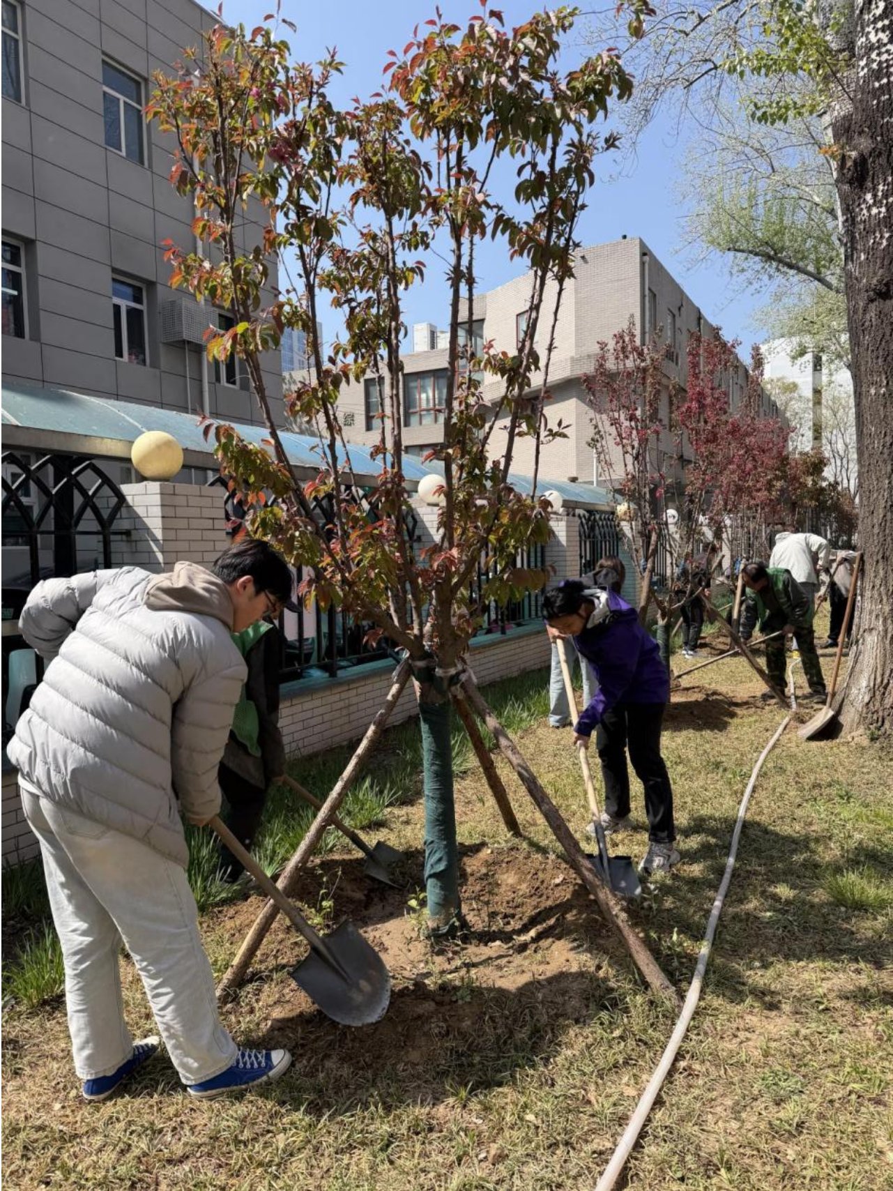 4月10日中午,在病理楼南侧绿地,30余名师生秩序井然,分工协作、热情饱满,挥锹铲土、修筑树堰、培土踩实、浇水,每一道环节都一丝不苟、有条不紊,新栽种的20余棵海棠迎风挺立、错落有致,展现了勃勃生机。